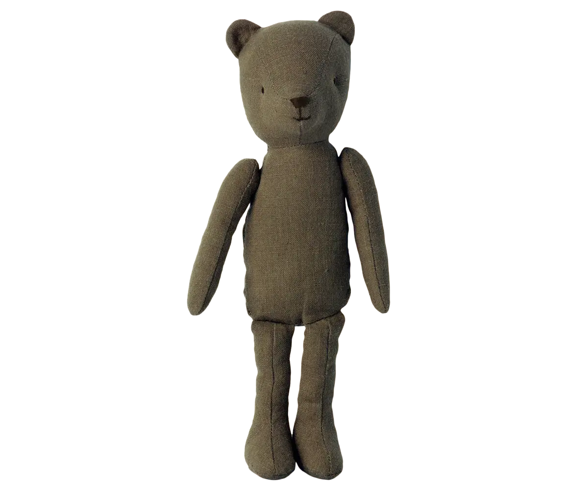 The Teddy bear family is a sweet collection of 4 different sizes of Teddy bears. They are made of soft linen and their shoulders are articulated so they can rotate and stay in place. The Teddy Family has a vintage look that will bring back dozens the memories. Dad is a Dusty Green color.